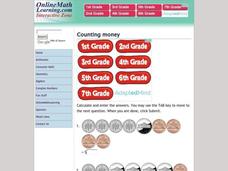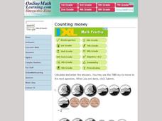 In this counting money worksheet, students count coins in problems up to quarters. Students complete 10 problems total on this worksheet.