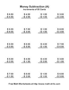 In this counting money worksheet, learners subtract the money amounts by increments of 50 cents. Students solve twenty money subtraction problems.
