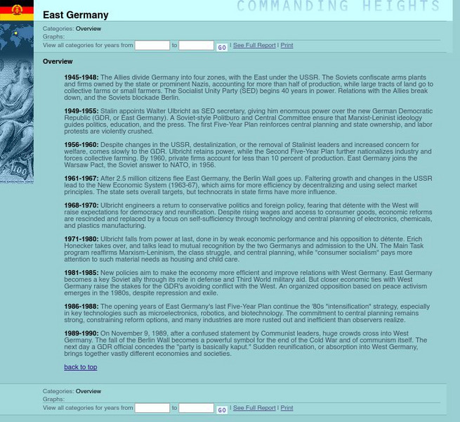 This timeline of East Germany from 1945 to 1990 chronicles key events from communist domination to political and economic freedom with the end of the Cold War and the dismantling of the Berlin Wall.