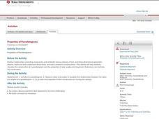 Young scholars explore the concept of angles formed by parallel lines.They graph two parallel lines cut by a transversal, then measure the angles formed by the transversal and record the data in a table. Learners make conjectures about...