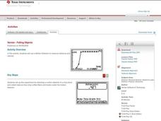 High schoolers examine the velocities of two different falling objects. They produce distance vs. time and velocity vs. time graphs using a Motion Detector and a CBL 2 to collect experimental data. Learners analyze and interpret the...