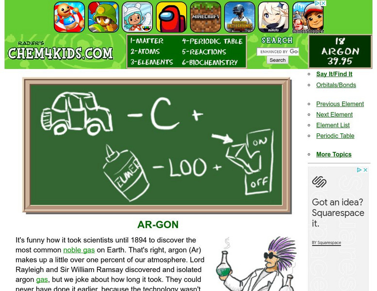 Chem4Kids looks at the 18th element in the periodic table, argon. Content focuses on argon's electrons, where you can find argon in nature and in the home, and how argon combines with other elements.