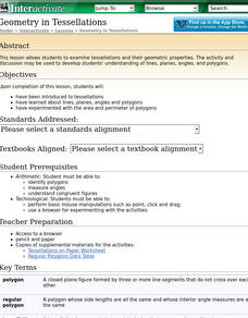 Students examine tessellations and their geometric properties. Students also develop a better understanding of lines, planes, angles, and polygons.