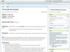 Seventh graders visually represent and analyze data using a frequency table. They recognize what values in a data set are bigger by looking at a bar graph and answer questions about certain bar graphs and what they represent. Students...