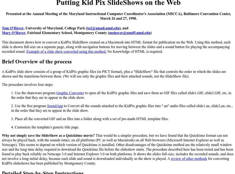This article shows how to convert a KidPix SlideShow created on a Macintosh into HTML format for publication on the Web. Using this method, each slide is shown full-size on a separate page, along with navigation buttons for moving...
