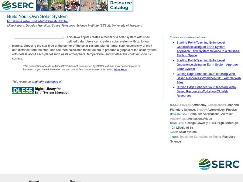 This Java applet creates a model of a solar system with user-defined data. Users can create a solar system with up to four planets, choosing the star type at the center of the solar system, planet name, size, eccentricity of orbit and...