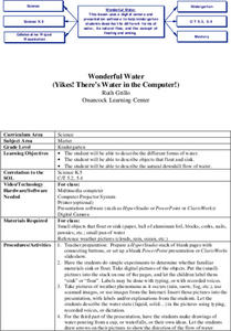 Students identify the various states of water and its natural flow downward. As a class, students take digital pictures of different forms of water and create a multimedia presentation describing their photographs. Groups of students...