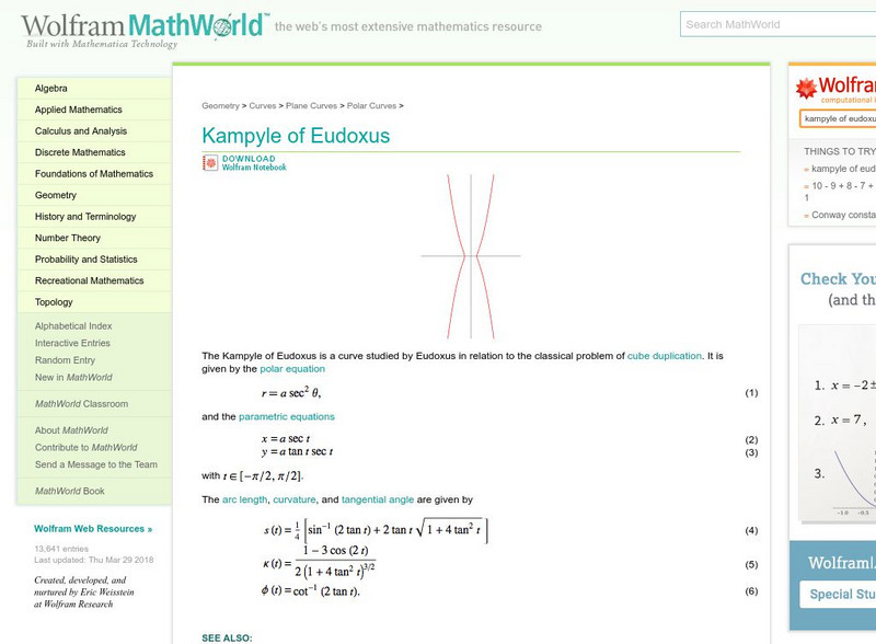 This page gives an illustration, equations, and short description of the Kampyle of Eudoxus, a type of curve studied by Eudoxus in relation to the problem of cube duplication.