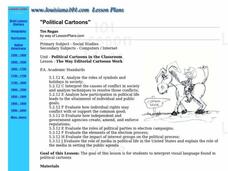 Learners explore political cartoons. In this government current events lesson, students analyze the visual language and symbolism present in five different political cartoons. Learners discuss the event or issue that inspired...