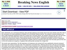 In this English worksheet, students read "Retire Later to Live Longer," and then respond to 47 fill in the blank, 7 short answer, 20 matching, and 8 true or false questions about the selection.