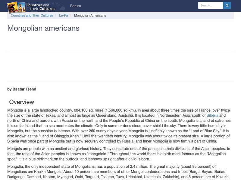 Provides an overview of the traditional culture and lifestyle of Mongolian Americans. (Note: Content is not the most current.)