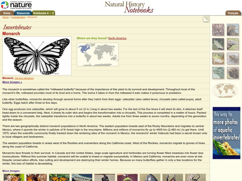 The Monarch butterfly is widely studied by students when they learn about insect life cycles. Basic information about the Monarch and threats to its survival are described here. There are also pictures showing the Monarch in various...