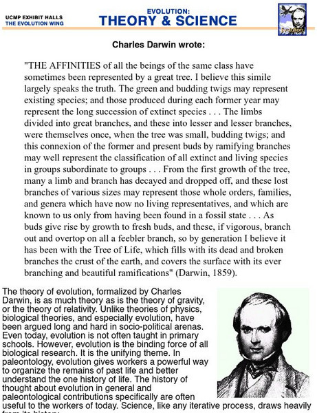 An introduction to Darwin's theory of evolution with hyperlinks to other topics on evolution, including a timeline of evolutionary thought.