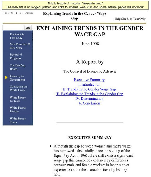 This White House site provides a report on the gender wage gap by the Council of Economic Advisers. Includes historical data and statistical information, information on the different factors that affect gender pay, what pay...