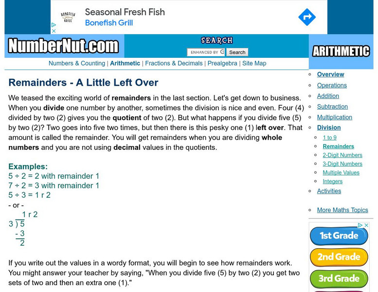 Explains what remainders are in division, and points out patterns in single-digit division. Makes reference to how remainders are related to decimals. Includes practice activities.