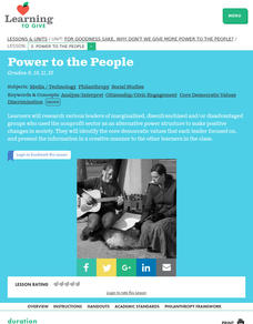 Students work together to research leaders of disadvantaged groups. They identify how these people use the nonprofit sector to make positive changes. They discuss how the leader uses the democratic core values and present the information...