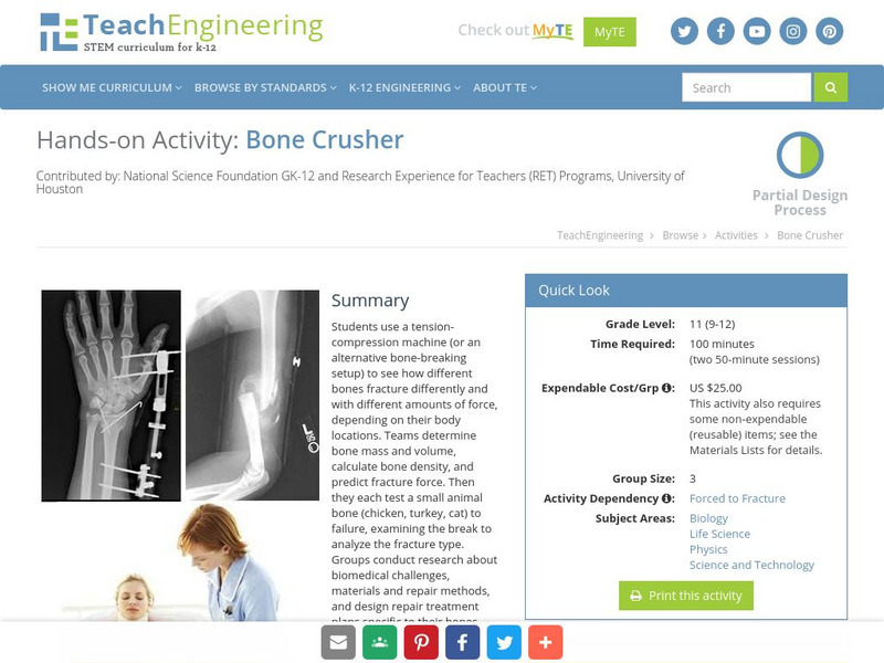 Students use a tension-compression machine or an alternative bone-breaking setup to see how different bones fracture differently and with different amounts of force, depending on their body locations. Teams determine bone mass and...