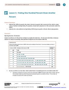 Class members solve problems to find the whole when given a percent. They use double line numbers and factors of hundred to help break the 100 percent into equal segments.