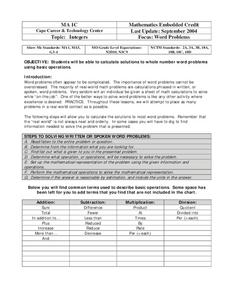 In this integers worksheet, students solve and complete 8 various types of word problems. First, they read each problem and determine from the information what they are looking for. Then, students determine the operations necessary to...