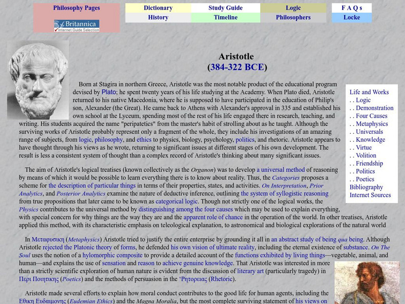 The life, philosophy and metaphysics of Aristotle (384-322 BCE) are surveyed. The aim of Aristotle's logical treatises (known as the Organon) was to develop a universal method of reasoning by means of which it would be possible to learn...