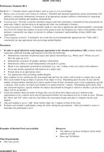 Young scholars practice their speaking skills by sharing information during show and tell about one object. Before giving their speech, they must analyze the relationship and space between them and the audience. They are evaluated by a...