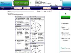 In this geometry lesson, 10th graders break down a circle and identify the different parts. They discuss chords, diameter, radius, circumference, major and minor segment. There are 42 problems broken down into 5 different sections.