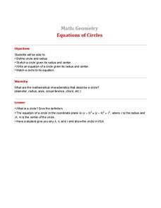 Young scholars will define circle and radius. In this radius lesson, students are given a circumference, they will write an equation and sketch the circle. Young scholars will match graphs of circles to their equations.