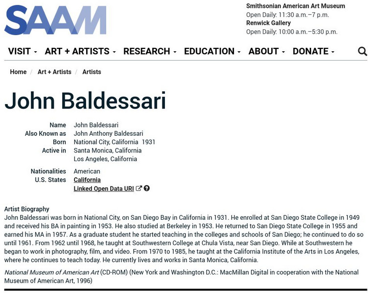 As part of the Smithsonian Art Museum's database of artists, this site provides brief biographical information on John Baldessari in addition to a link to view "Black Dice," a work of Baldessari's at the museum.