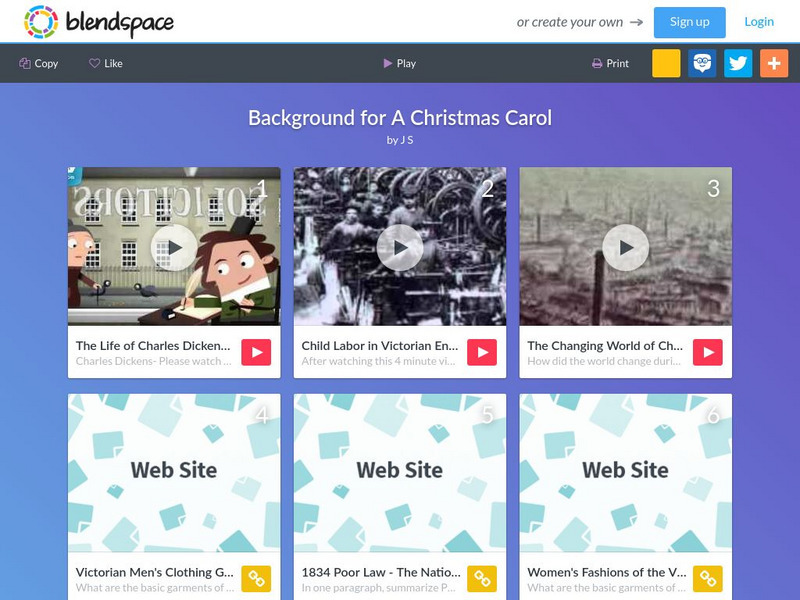 A six-part learning module with links to videos, websites, and a picture providing information about Charles Dickens and Victorian England.