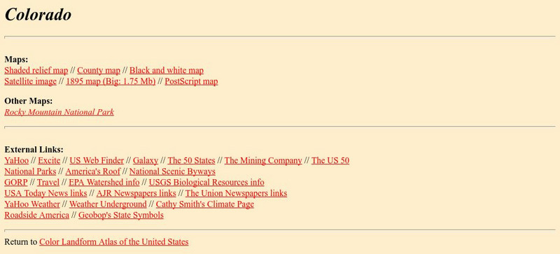 At this site from The Johns Hopkins University Applied Physics Laboratory, you can look for Colorado landmarks and landforms at this site. You will find several different types of maps at this site. Look for black and white maps and...