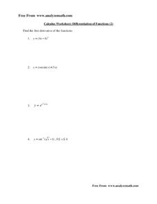 In this differentiation of functions worksheet, students find the first derivative of given functions. Functions contain exponents and square roots. This three page worksheet contains nine multi-step problems.