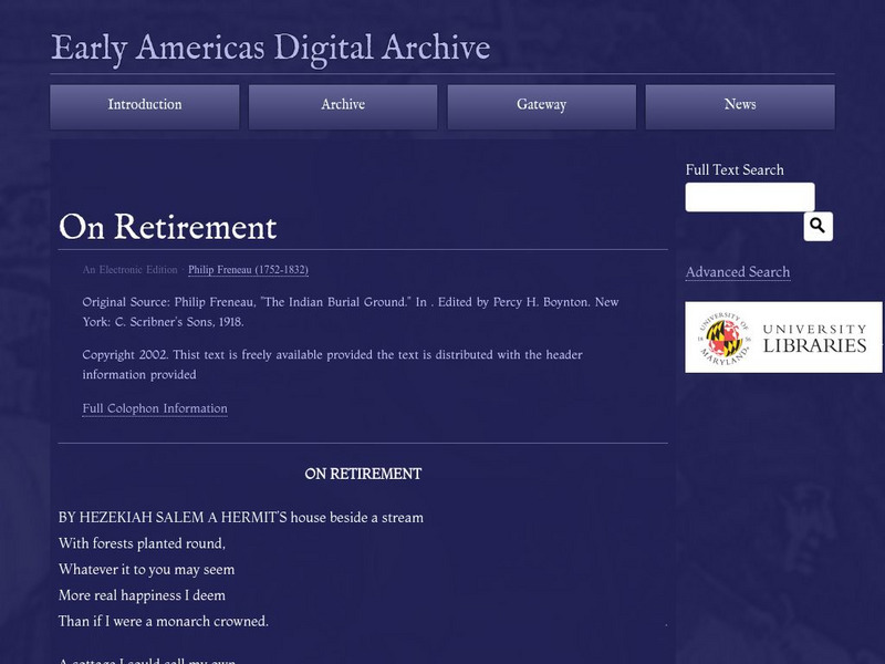The complete text of the poem "On Retirement" by Philip Freneau.