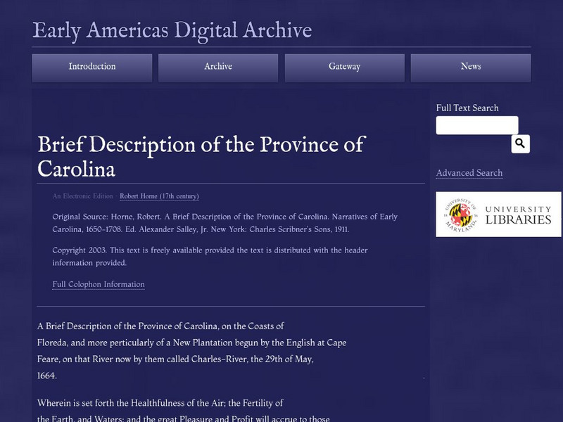 Early Americas Digital Archive: Brief Description of the Province of Carolina