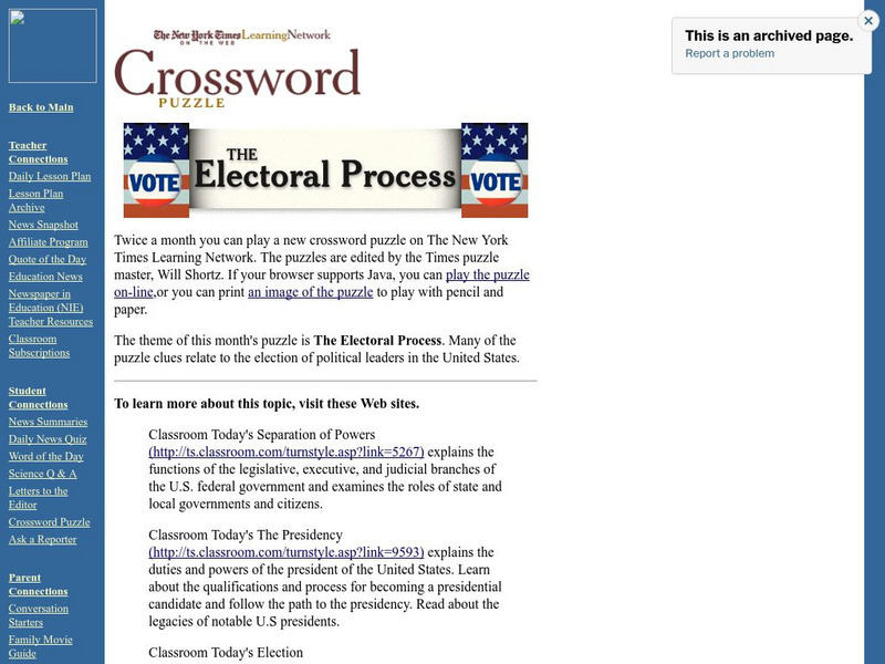 Twice a month you can play a new crossword puzzle on The New York Times Learning Network. This one is called "The Electoral Process."