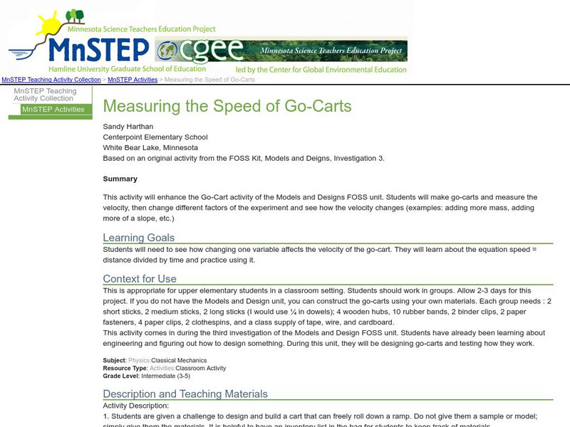 Students will make go-carts and measure the velocity, then change one variable and see how the velocity changes. They will learn about the equation speed = distance divided by time and practice using it.