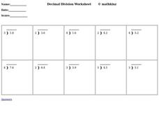 In this math instructional activity, students solve 32 division problems. For each problem, students divide whole numbers with decimals in the tenths place.