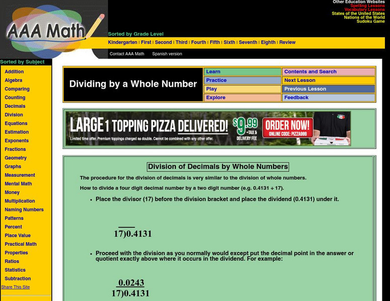 Explains how to divide a decimal by a whole number. Also provides some practice problems and games to test your skills.