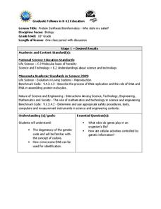 Eighth graders explain how protein is made in the cell. In this biology instructional activity, 8th graders translate RNA and DNA using an internet database. They determine the thief based on evidence collected.