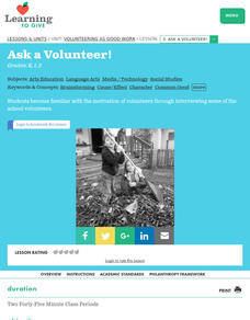 Young scholars investigate the motivation of volunteers. In this philanthropy lesson, students interview school volunteers on why they volunteer and write thank-you letters to them