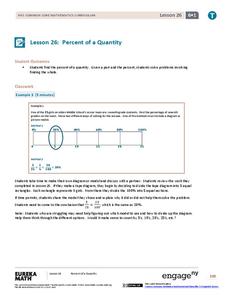 Visualize methods of finding percents. Classmates find a percent of a quantity using two methods including a visual model in the 26th lesson in a series of 29. By the end of the lesson, scholars find percents given a part and the whole...