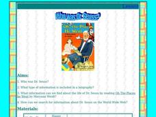 Learn more about Dr. Seuss in an author study activity. After young readers create a KWL chart on information they know about Dr. Seuss, they take on group roles, such as the researcher or recorder, to find out more about Dr....