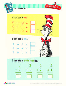 In this addition worksheet, students add one digit numbers up to 3 based on the book The Cat in the Hat. Students complete 10 problems.