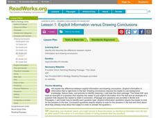 Fourth graders read a comprehension passage and answer short answer questions and then identify their answers as explicit information or drawing conclusions. In this comprehension lesson plan, 4th graders do this as a whole and individuals.