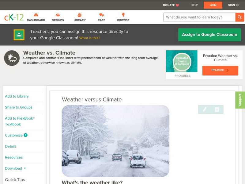 [Free Registration/Login may be required to access all resource tools.] Compares and contrasts the short-term phenomenon of weather with the long-term average of weather, otherwise known as climate.