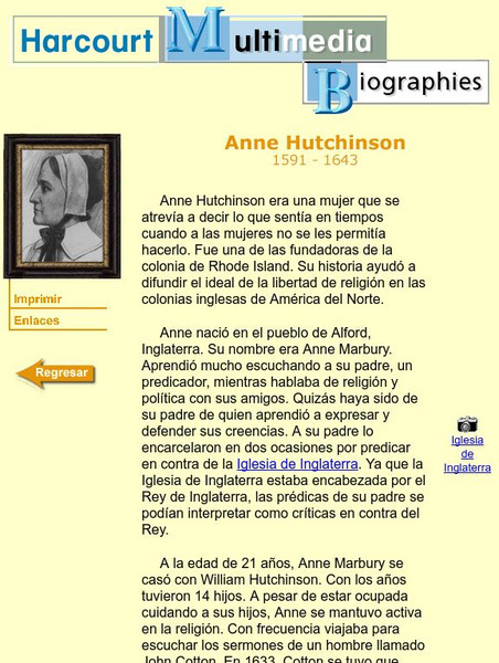 Harcourt: Biographies: Anne Hutchinson (Spanish)