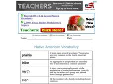 If your class is learning about Native American culture or life, a vocabulary sheet might come in handy. There are 12 terms, each with a full definition included. Terms include buffalo, tepee, hogan, wampum, prairie, tribe, myth,...