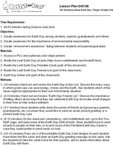 Learners complete activities that help clean up the Earth and protect the environment. In this Earth protection lesson, students go outside and listen to the environment. Learners discuss their observations and their role in protecting...