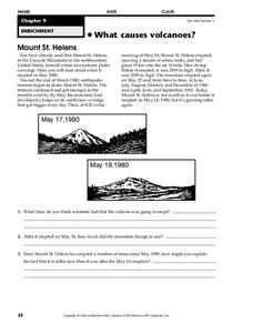 In this volcano worksheet, students will read about the events that led to the eruption of Mount St. Helens in 1980. Students will use this information to complete 3 short answer questions.