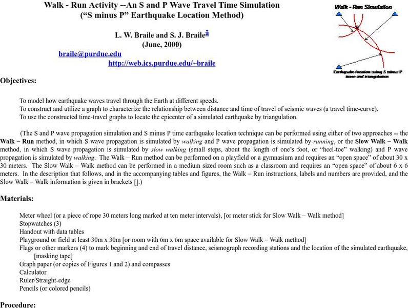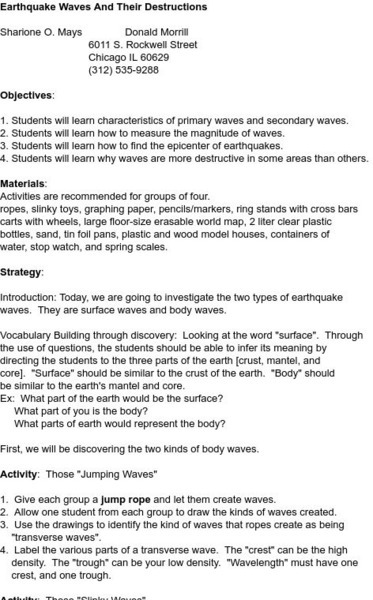 A classroom simulation modeling how earthquake waves travel through Earth at different speeds. A graph is constructed to demonstrate the relationship between the distance and time of travel of seismic waves, and then used to locate the...