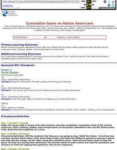Second graders complete a written activity as well as play a review game about the Eastern Woodland Indian tribe and the Plains Indian tribe - natural resources, food, shelter, clothing, transportation, etc.